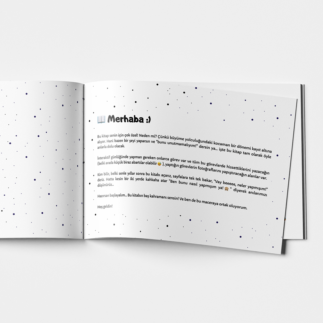 Anaokulu ve ilkokul çağındaki çocuklar için özel olarak tasarlanmış bu interaktif günlük, yalnızca yazmakla kalmaz; düşünmeye, hissetmeye ve hatırlamaya da davet eder. Günlükte çocuklara verilen eğlenceli görevler, onların hayal gücünü ve duygusal farkındalığını geliştirirken, aynı zamanda eğlenceli bir öğrenme süreci sunar. Her görevden sonra çocuklar, ne yaşadıklarını, nasıl hissettiklerini yazıyor ve dilerlerse ilgili anın fotoğrafını günlüğe yapıştırıyor.